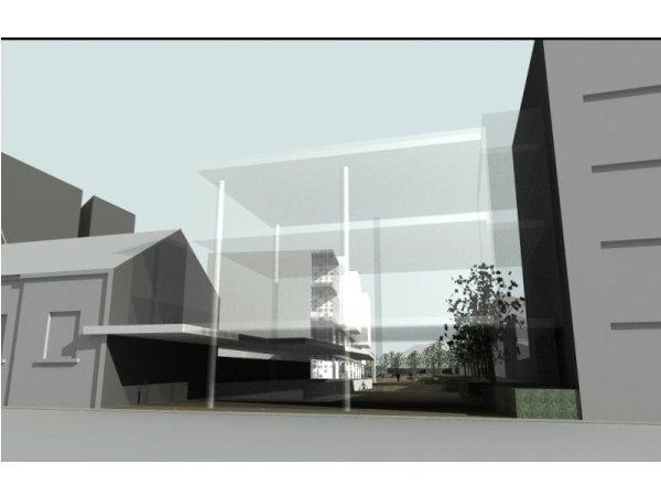 Az épület jellegzetességét adó tömör 1-2 és többszintes kubus mögött nem található meg a hasonlóan kialakított térszervezés. A keleti és nyugati homlokzatok között nem fedezhető fel hasonlóság, mintha nem is egy épület lenne. A létesítmény a környező utcákról megfelelően tárul fel, nem hivalkodóan mutatkozik, de az utcai foghíjak eltüntetését nem oldja meg.